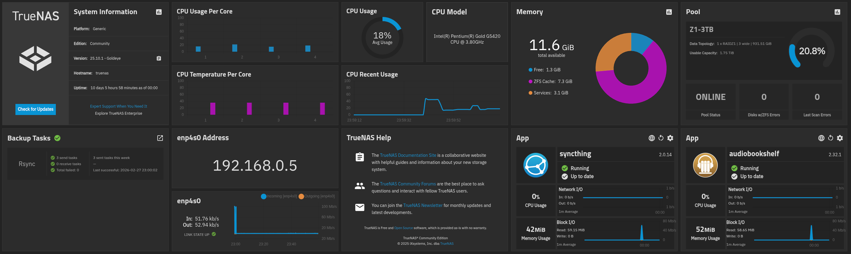 This is where the libraries for Audiobookshelf (my self-hosted audiobook and podcast server) and Immich (my self-hosted Google Photos replacement) actually live. Since the data resides on TrueNAS, it gets backed up to my gaming PC’s spare 1TB HDD via Rsync, and separately backed up to Storj.