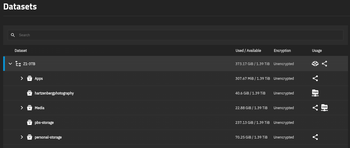 Let’s look at the datasets I have on TrueNAS and what lives in each one.