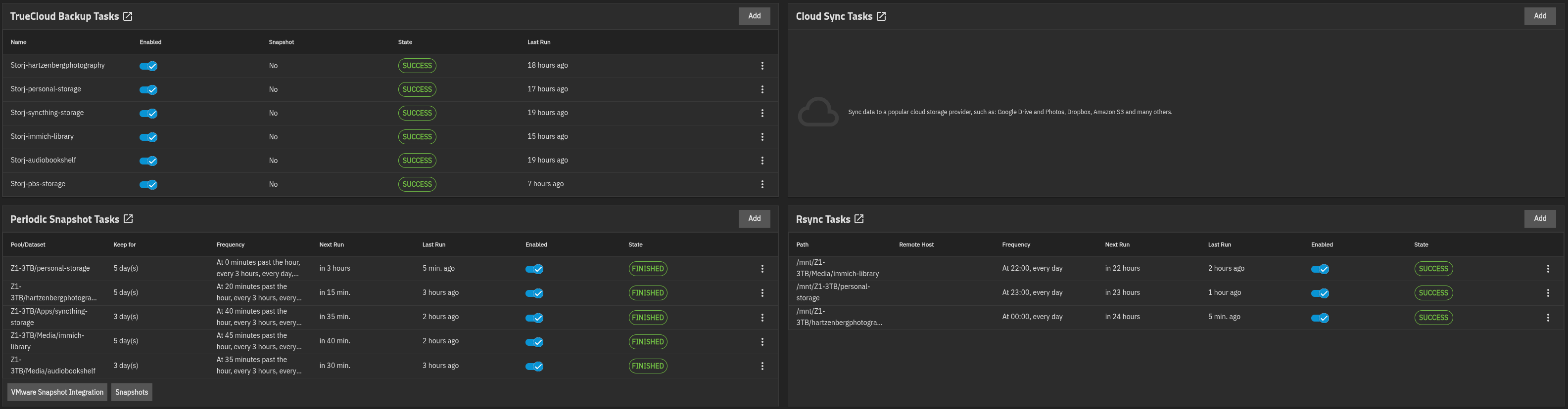 Every dataset on my TrueNAS — pbs-storage, Media, personal-storage, and hartzenbergphotography — gets snapshotted automatically on an hourly schedule. The snapshots are staggered across the hour (some at :00, some at :20, some at :40, and so on) to avoid all datasets hammering the disks at once. Each dataset retains approximately 3 days’ worth of snapshots before older ones are automatically pruned.